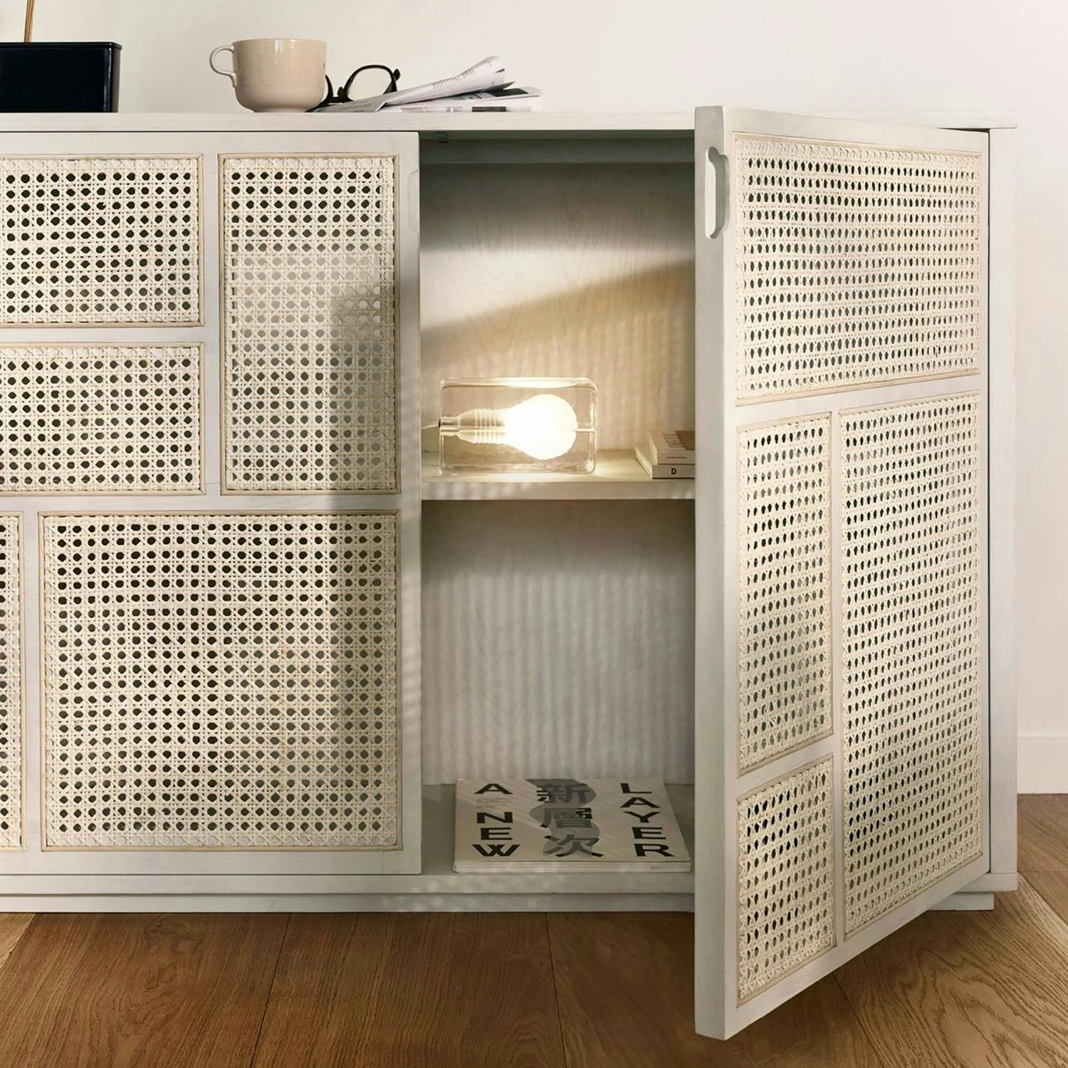The woven cane gives it a visible surface, but also provides a sense of depth. You can glimpse what’s inside, adding some careful mystery to the piece. The fact that the design is transparent also fulfils a function. The woven cane ventilates the cupboard which is practical when storing both clothes and electronic devices. Available in three colours.