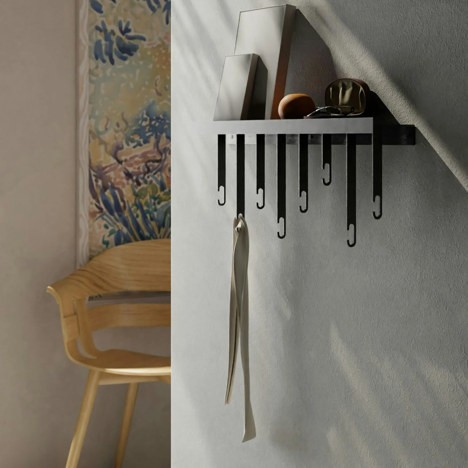Atelier Wall hanger from Design House Stockholm is designed by Alexander Lervik, and is characterized by its decorative and smart design. It has eight hooks with different lengths which gives you the opportunity to hang many jackets and bags, while it gives you a quick and easy overview. The top works as a shelf, where you can place for example art, scarves or keys.