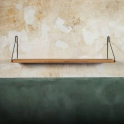 The shelf is made of dark oiled solid oak and the brackets are available in brass or black lacquered steel. Choose between different widths and depths.