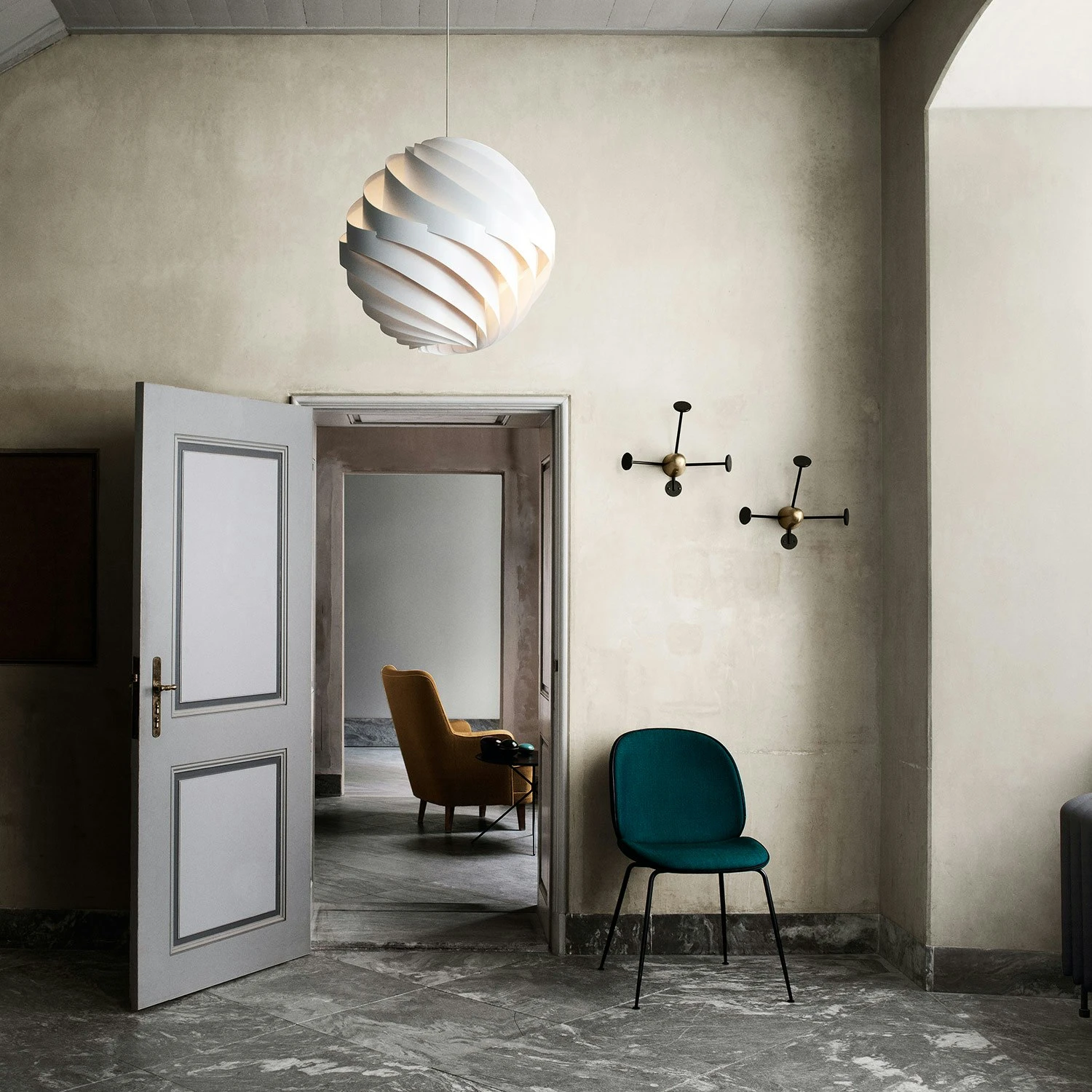 Beetle Dining Chair, designed by GamFratesi for Gubi. The inspiration of the Beetle Chair was found in the insect world as GamFratesi has been looking closely at the anatomy, aesthetics and movement of a beetle. The design of the chair reinterprets the characteristic elements of the beetles’ sections: shape, shells, sutures, rigid outside and soft inside. The seat consists of two separate inner shells of moulded veneer. It rests on a stable leg stand of steel or wood with different finishes. Beetle Chair is also available as un-upholstered, with an upholstered seat and front upholstery.