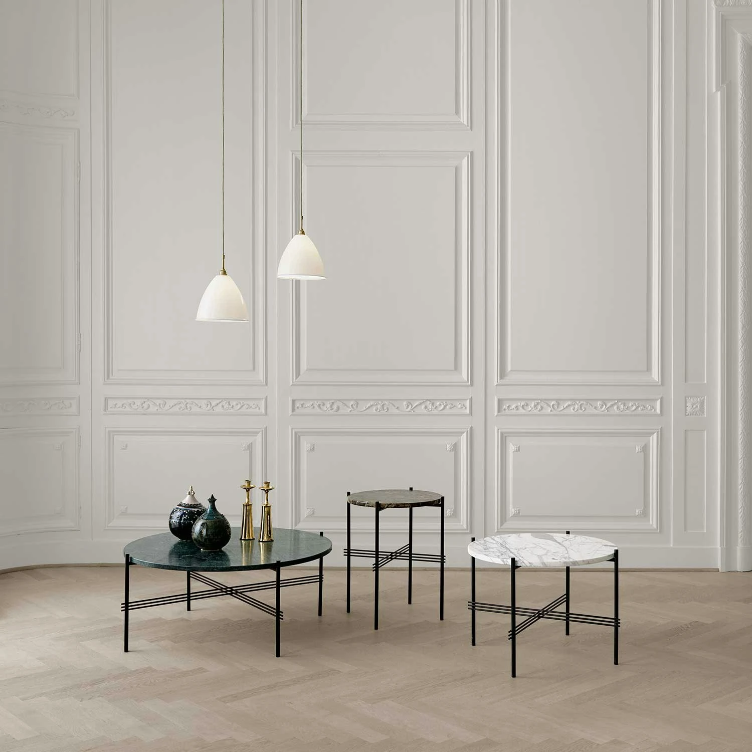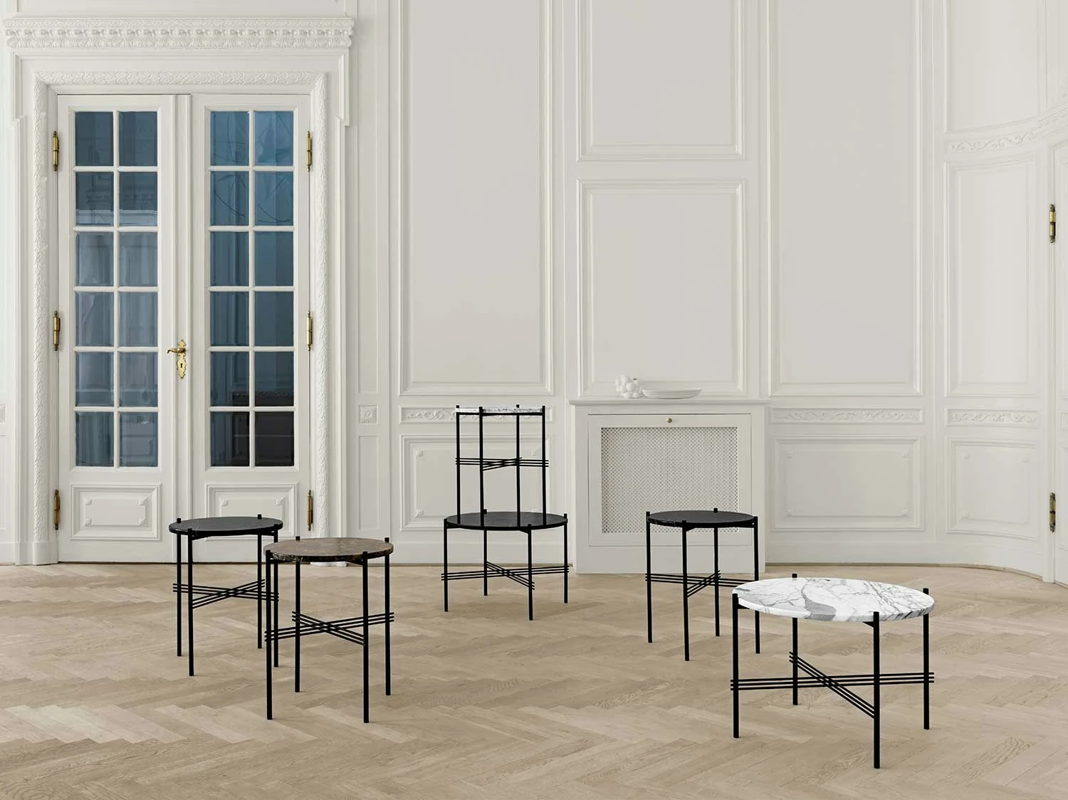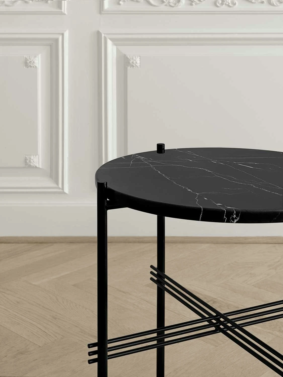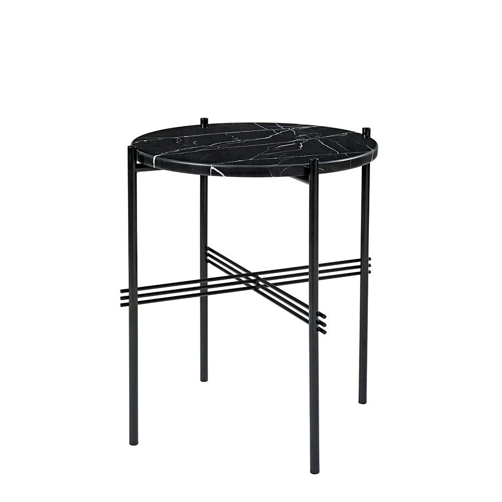 Ts Side Table, designed by GamFratesi for Gubi. Ts creates a sophisticated and sculptural aesthetics for any room with its characteristic slender legs, beautifully crossing details and contrasting solid table top. Also available with brass leg stand and with marble in several colours.