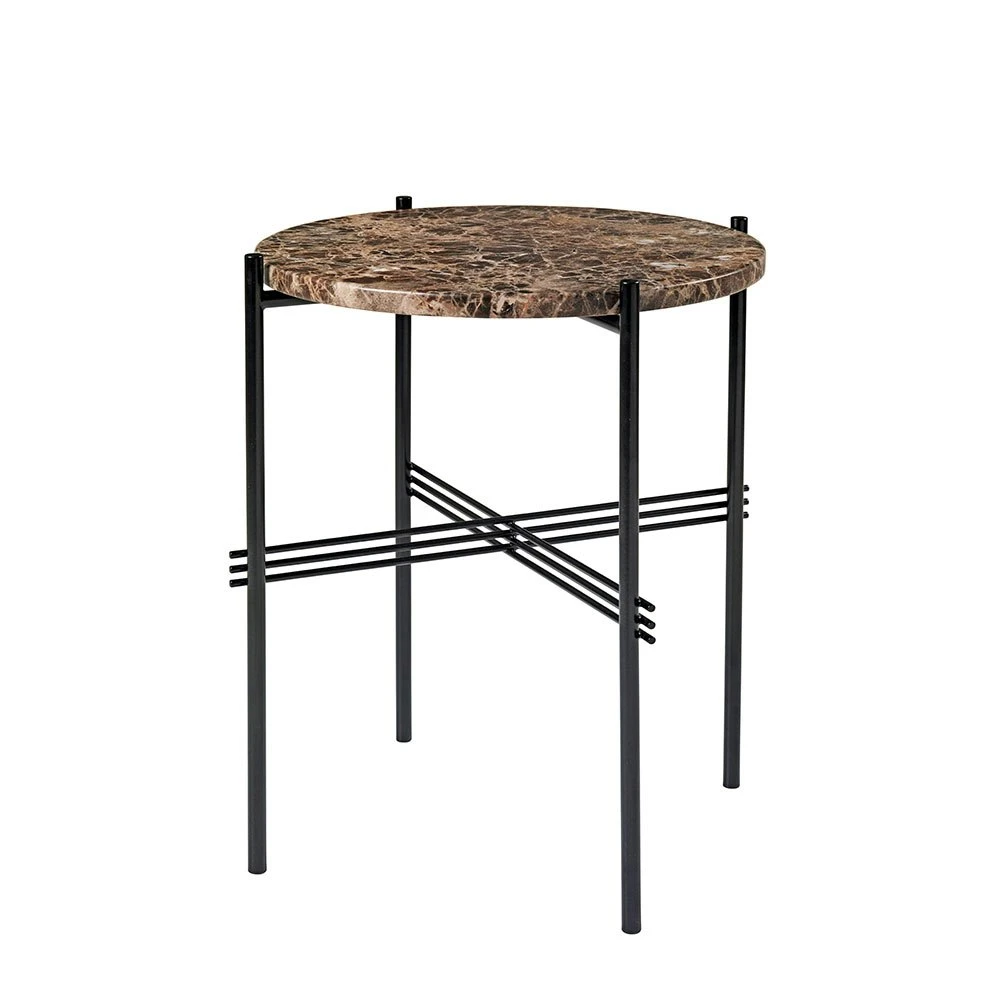 Ts Side Table, designed by GamFratesi for Gubi. Ts creates a sophisticated and sculptural aesthetics for any room with its characteristic slender legs, beautifully crossing details and contrasting solid table top. Also available with brass leg stand and with marble in several colours.