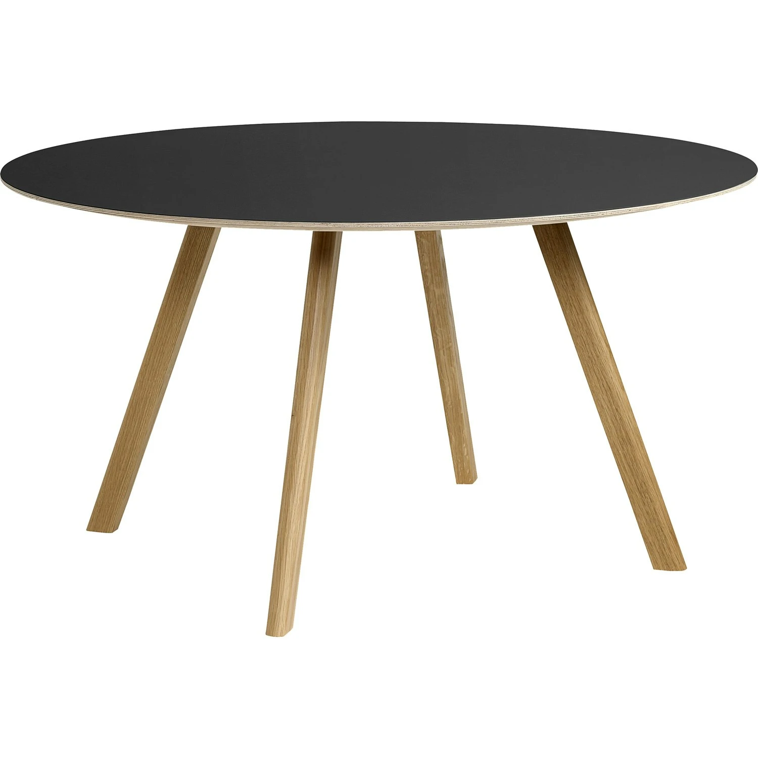 – Round, versatile table with four slanted legs.