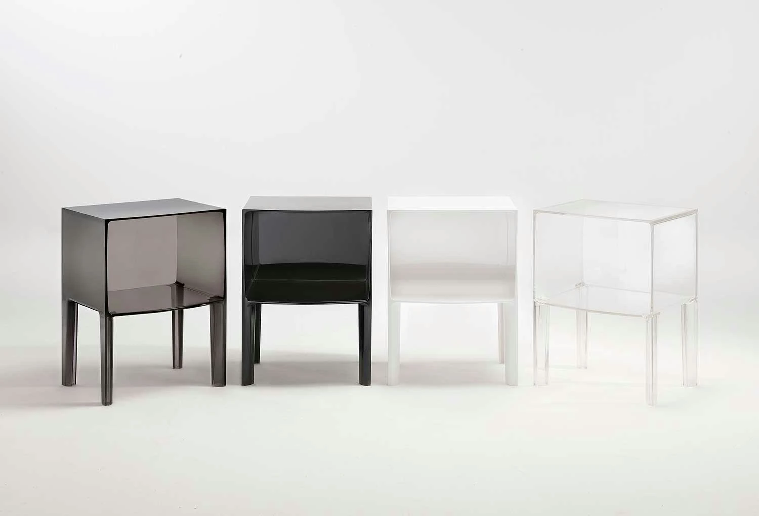 Ghost Buster from Kartell, designed by Philippe Starck. This furnitures design is based on classic design language but a modern expression has been added with the unique plastic material. Together, the straight lines and slightly curved corners give this furniture its special character. Ghost Buster suits as well as a side table in the living room as a bedside table. Available in several colours and two different sizes.