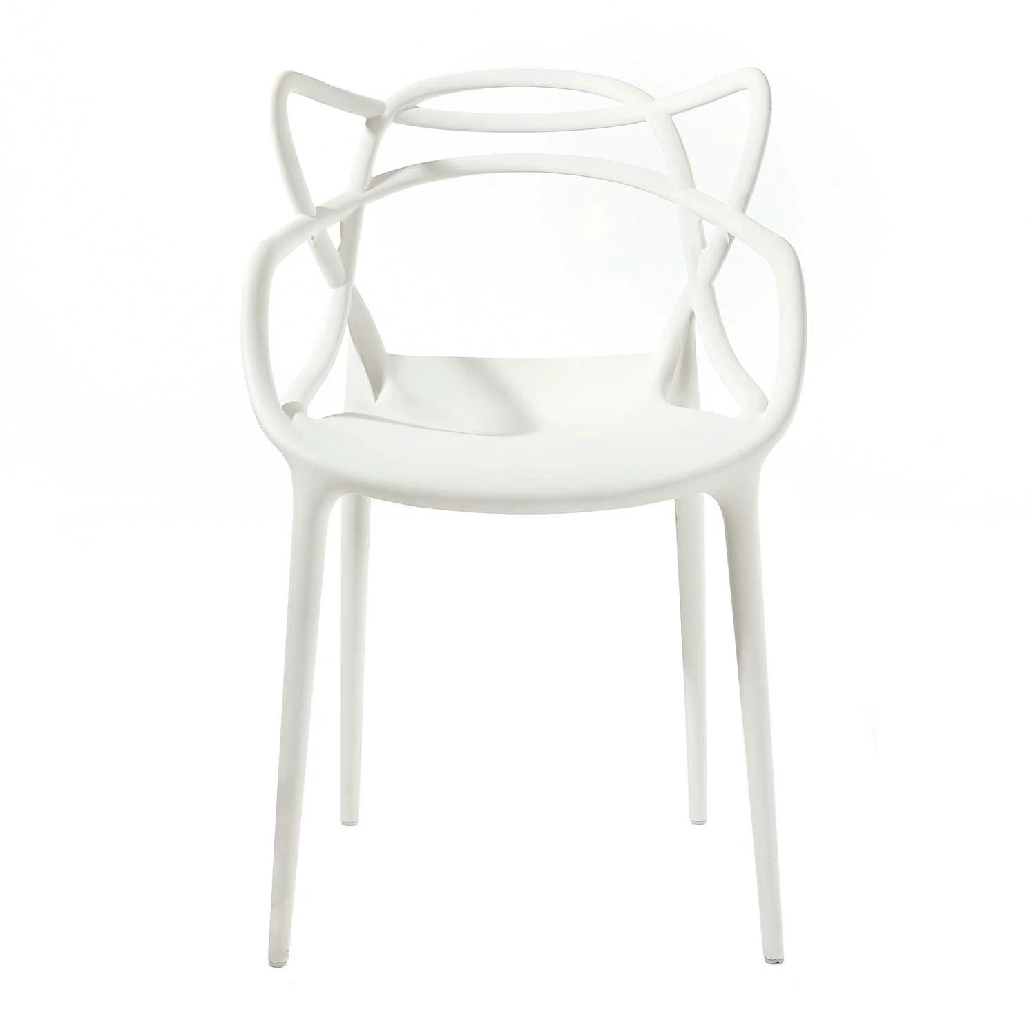 The seat is spacious and comfortable and rests on four gracile legs. Masters distinguish itself with their steady but simultaneously open backrest, which consists of the silhouettes of the three classic chairs. Masters is suitable for indoor use as well as outdoors. Stackable up to four chairs.