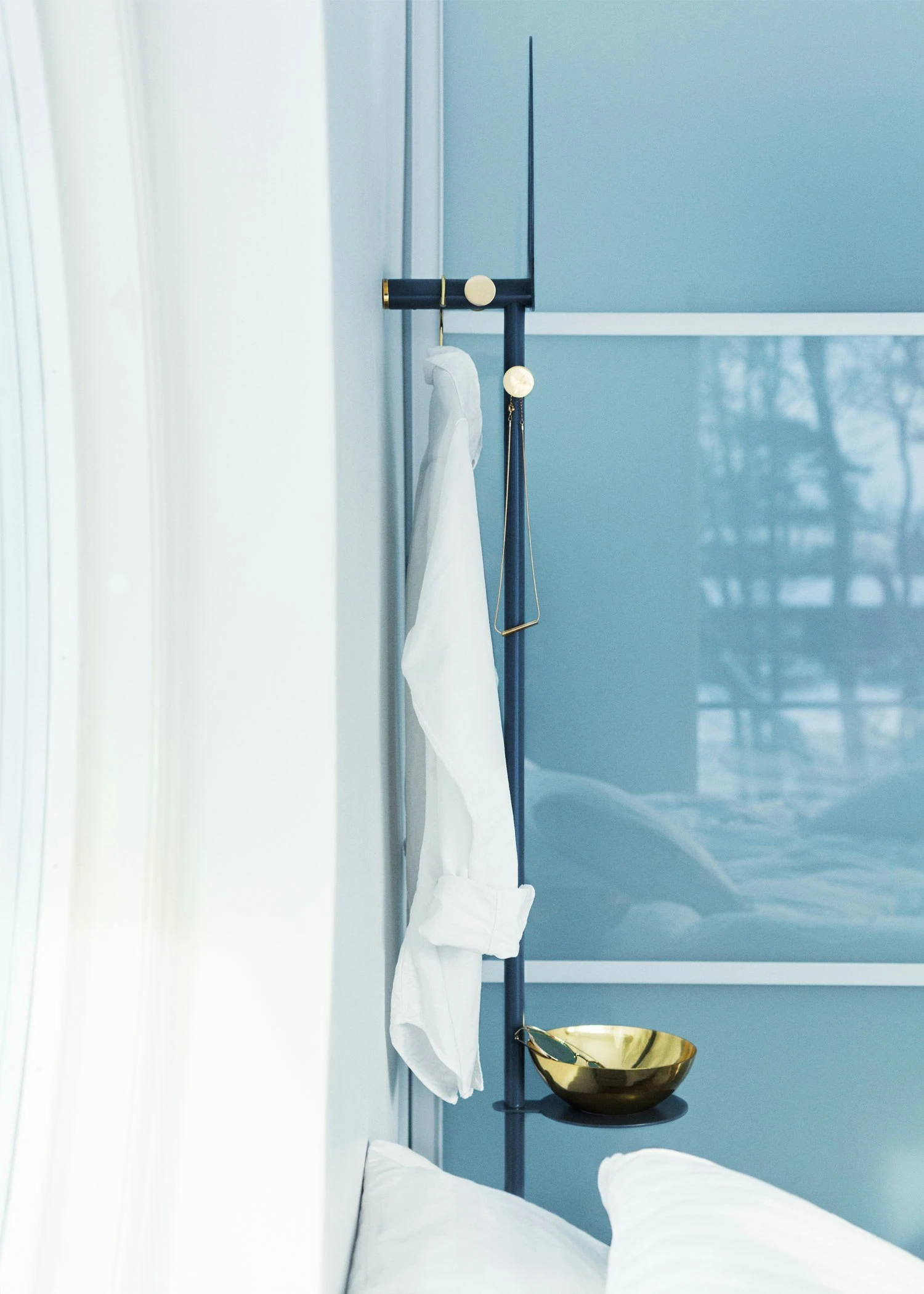 Monokel Clothes Hanger, designed by Sofia Almqvist for Klong. A wall mounted clothes hanger with clever design and carefully thought out details that allow storage of everything from clothes to accessories. Use the hooks and closes for garments and put small things from the pocket in the brass bowl.
