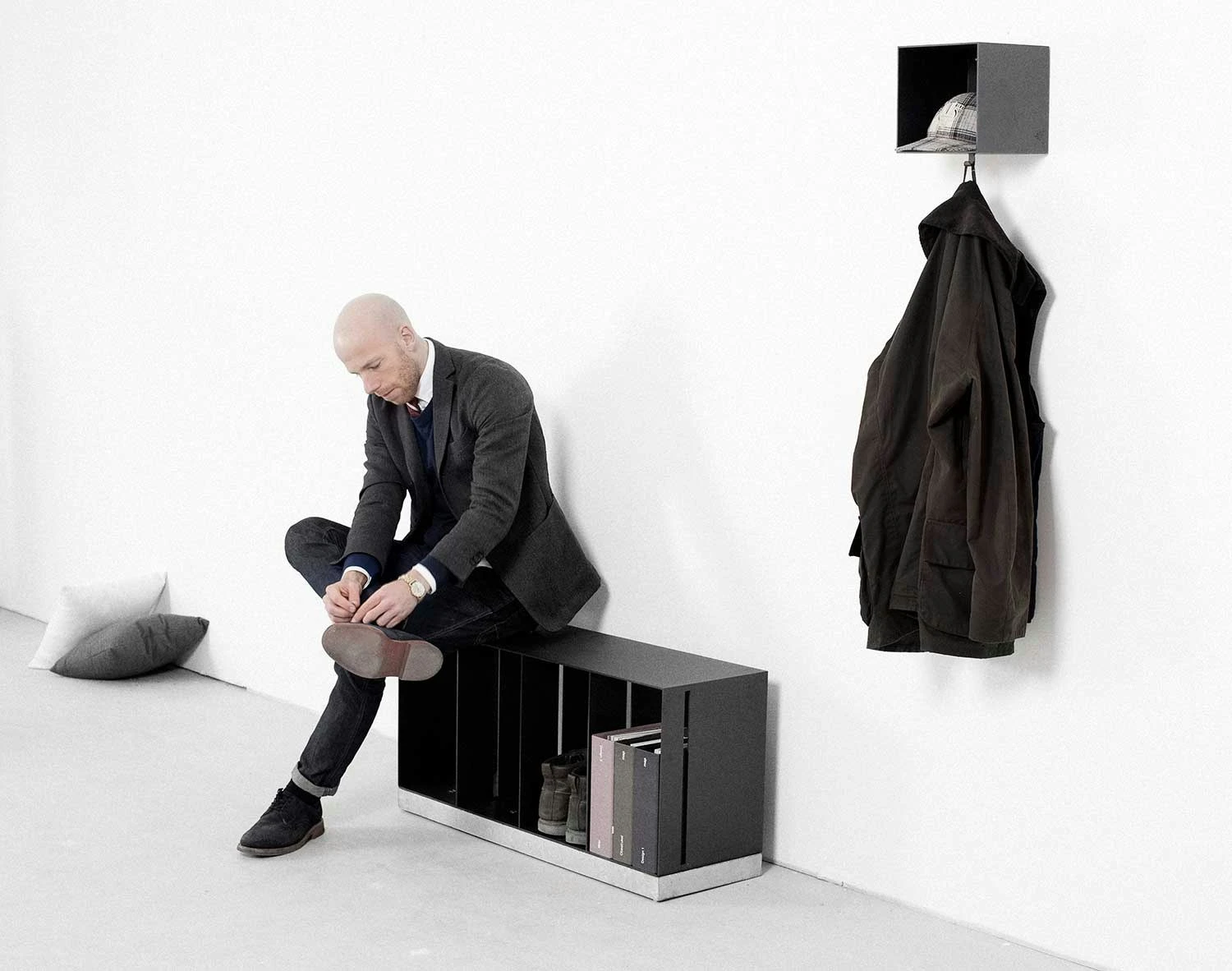 Manhattan Bench, designed by Cornelia Lindlöf for Röshults, is a sturdy bench with versatile storage facilities. Use as a shoe shelf, magazine storage or TV bench. Made of iron and concrete.