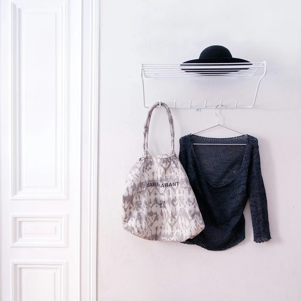 Hat Rack Hat Rack, designed by Olof Kolte for Maze. A stylish hat rack made of environmentally friendly metal wire. Simple and practical of its kind and fits perfectly in the small hall. Accompanied by six hooks with good possibilities for storing clothes and accessories. Available in two sizes. The same series also includes Mitten Shelf and Shoe Shelf.