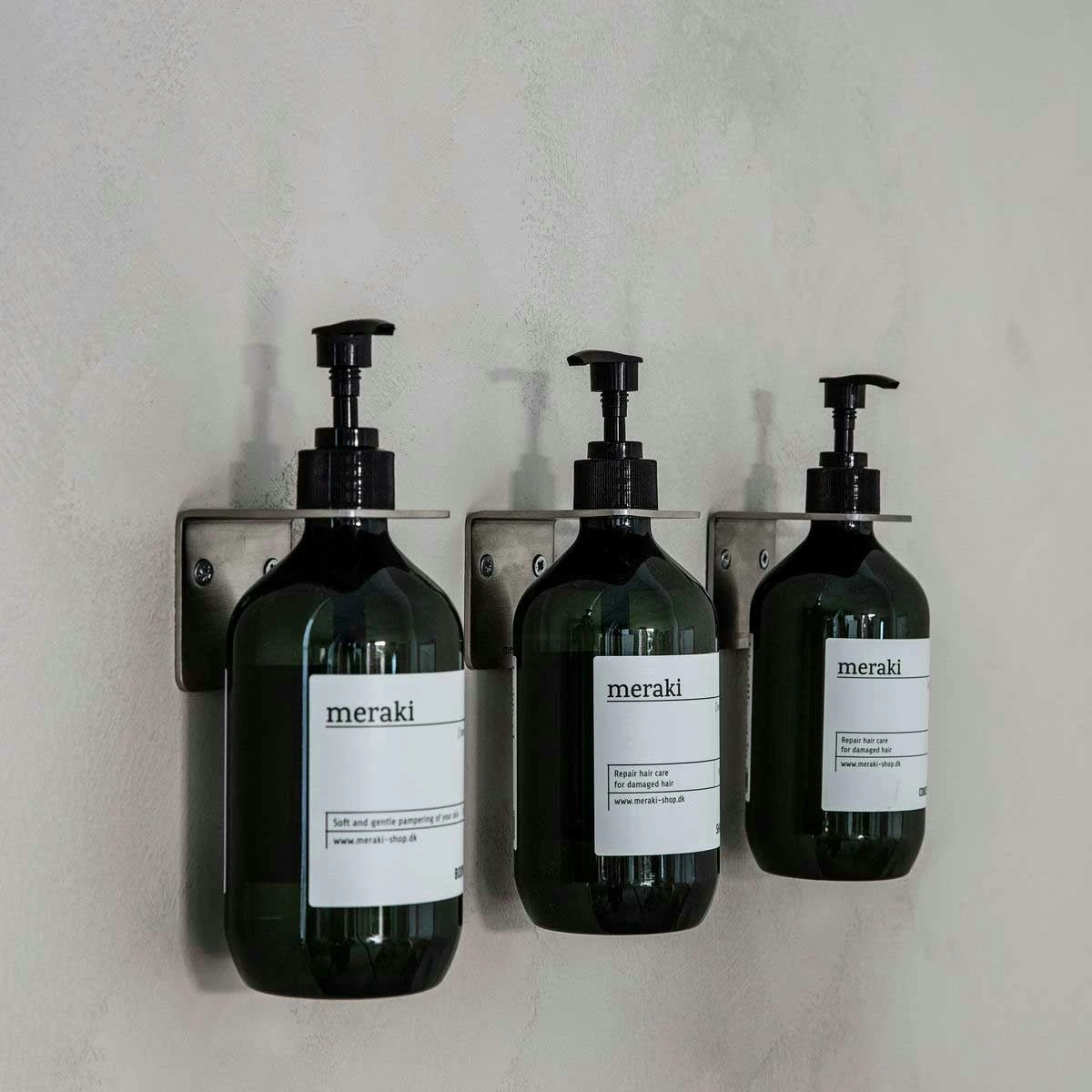Supply Wall Bracket from Meraki is an elegant holder for pump bottles, such as your soap pump, shampoo or lotion. The brass or silver finish makes the holder a nice detail in the bathroom or at the kitchen sink.