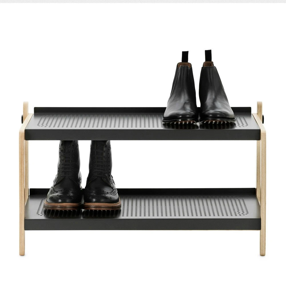 Sko from Normann Copenhagen is a shoe rack with both an industrial and simple feel and is made with robust, Scandinavian materials. Sko has been designed without any unnecessary components. It consists of a wooden frame with two perforated steel shelves held together by accentuated screws. Sko comes flat packed and includes the necessary tools for assembly as well a manual.