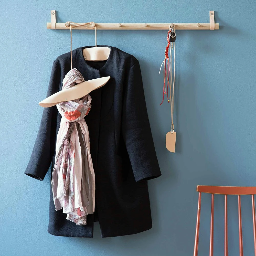 Rack Hooks from by Wirth. Inspired by the classic hanger with classic hooks. Rack is available in two sizes to suit both small and large homes and can be used in both the hall and the bathroom. The leather and rod are stuck together in order to not break under your clothes weight.